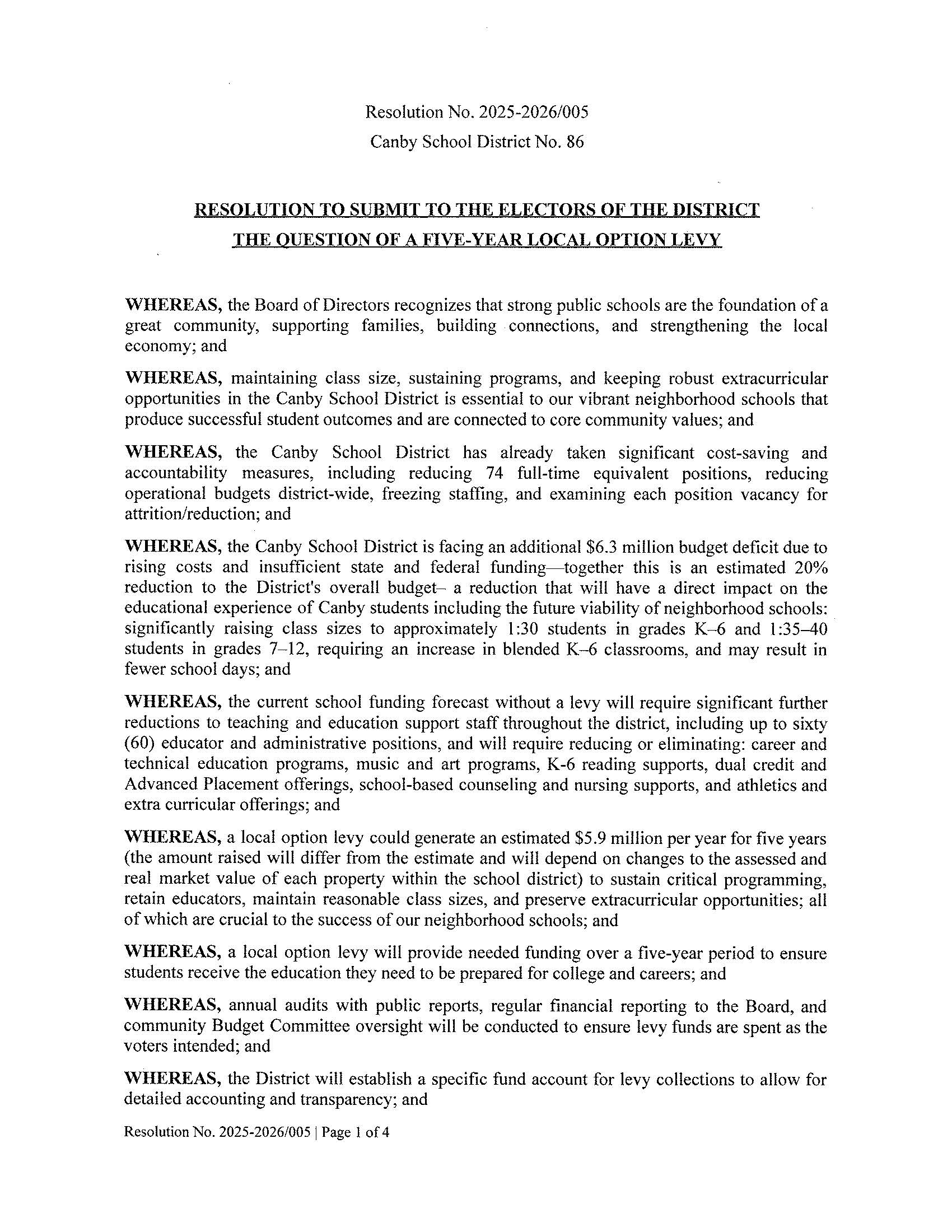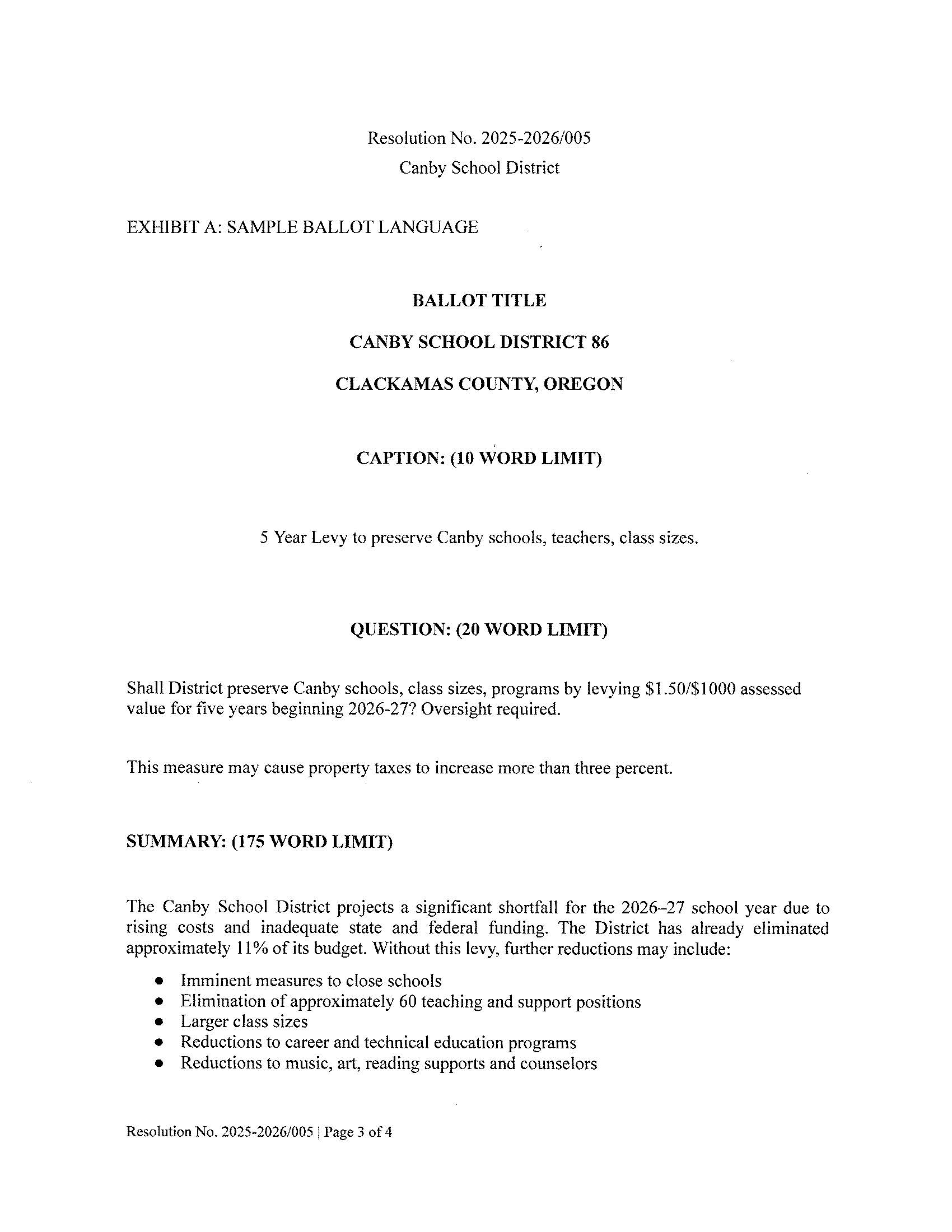 Ballot LanguageBoard Resolution & Ballot Language Board Resolution Draft Ballot Caption, Question, and Summary The 2026 Proposed Canby Schools Levy